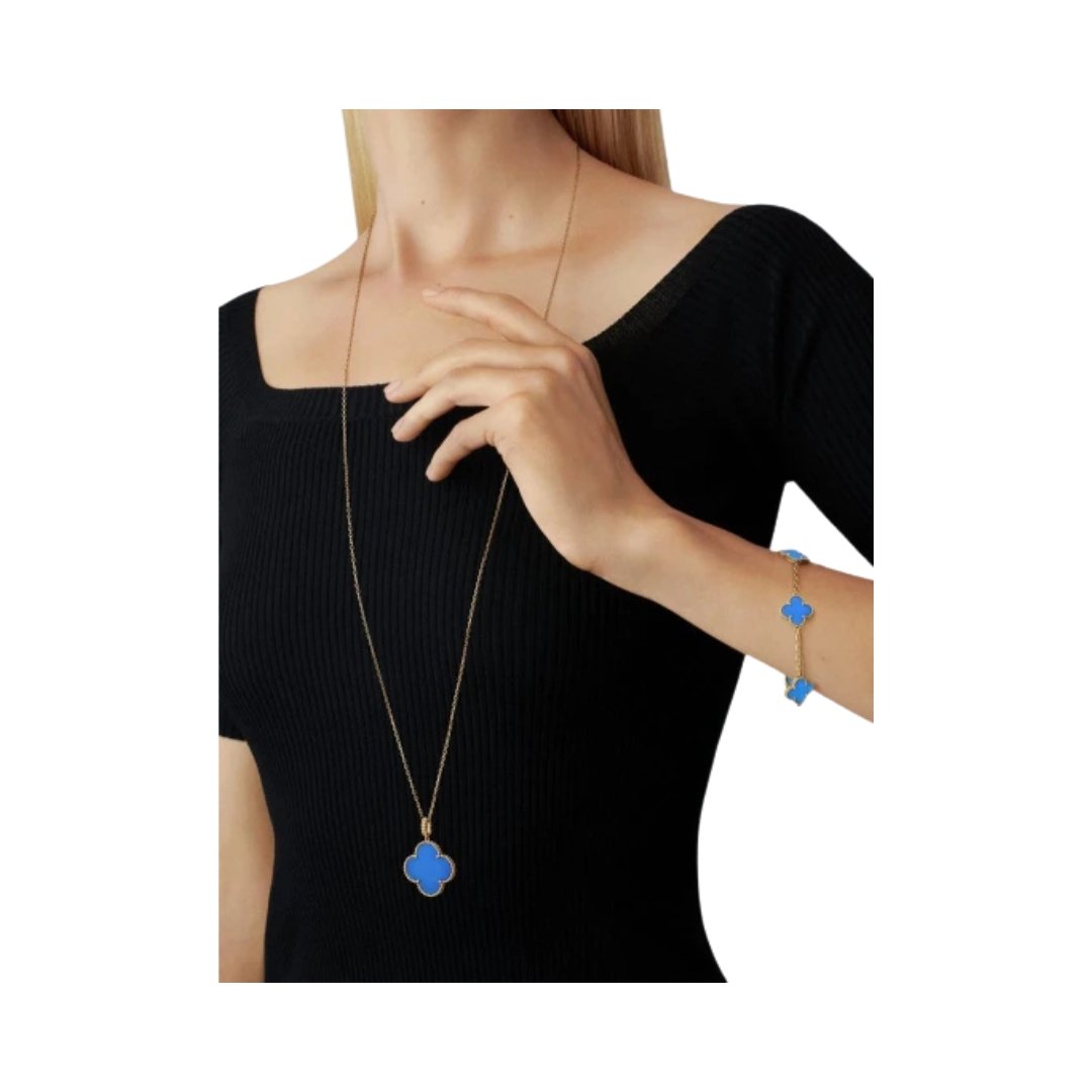 reated in 2006 by Van Cleef & Arpels, the Magic Alhambra? jewelry creations gather different-sized Alhambra motifs, coming together in a joyful dance. Inspired by the clover leaf, their asymmetric designs feature different associations of materials. The single-motif Magic Alhambra long necklace reveals another way of playing with the size and materials of the iconic motif. A transformable piece, this jewel may be worn in several ways, including long on a single chain or short with a doubled chain. Magic Alhambra long necklace, 1 motif, 18K yellow gold, blue agate.